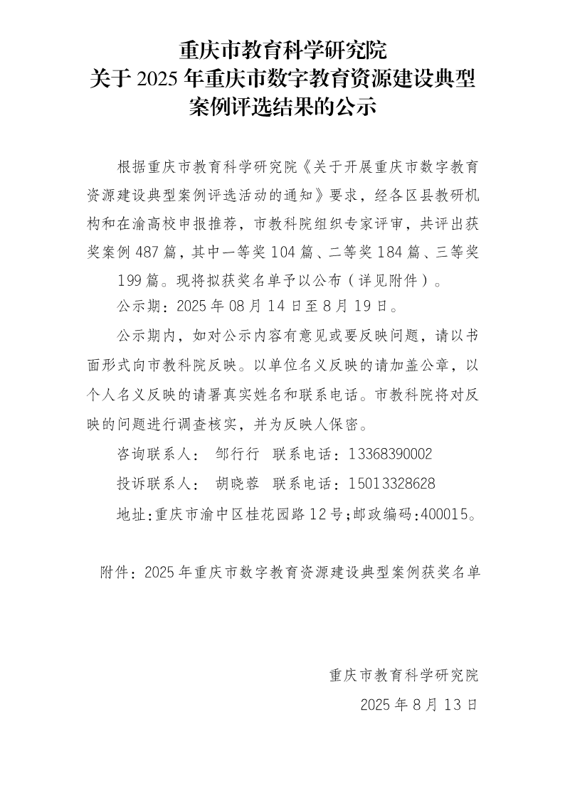 重庆市教育科学研究院关于2025年重庆市数字教育资源建设典型案例评选结果的公示