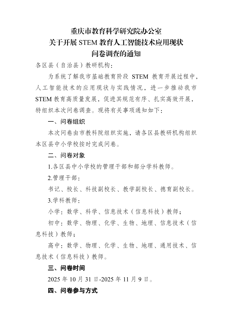 重庆市教育科学研究院办公室关于开展 stem 教育人工智能技术应用现状问卷调查的通知