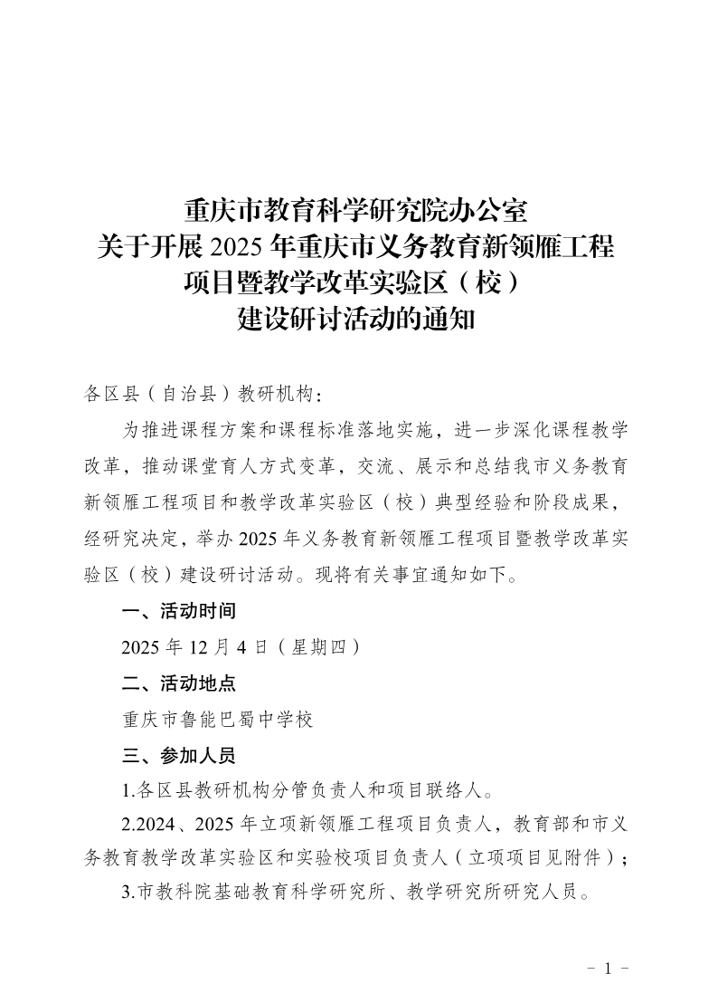 重庆市教育科学研究院办公室关于开展2025年重庆市义务教育新领雁工程项目暨教学改革实验区(校) 建设研讨活动的通知 作者: 来源: 发布时间:2025年11月12日 点击数: 次 【字体: 】 分享到: