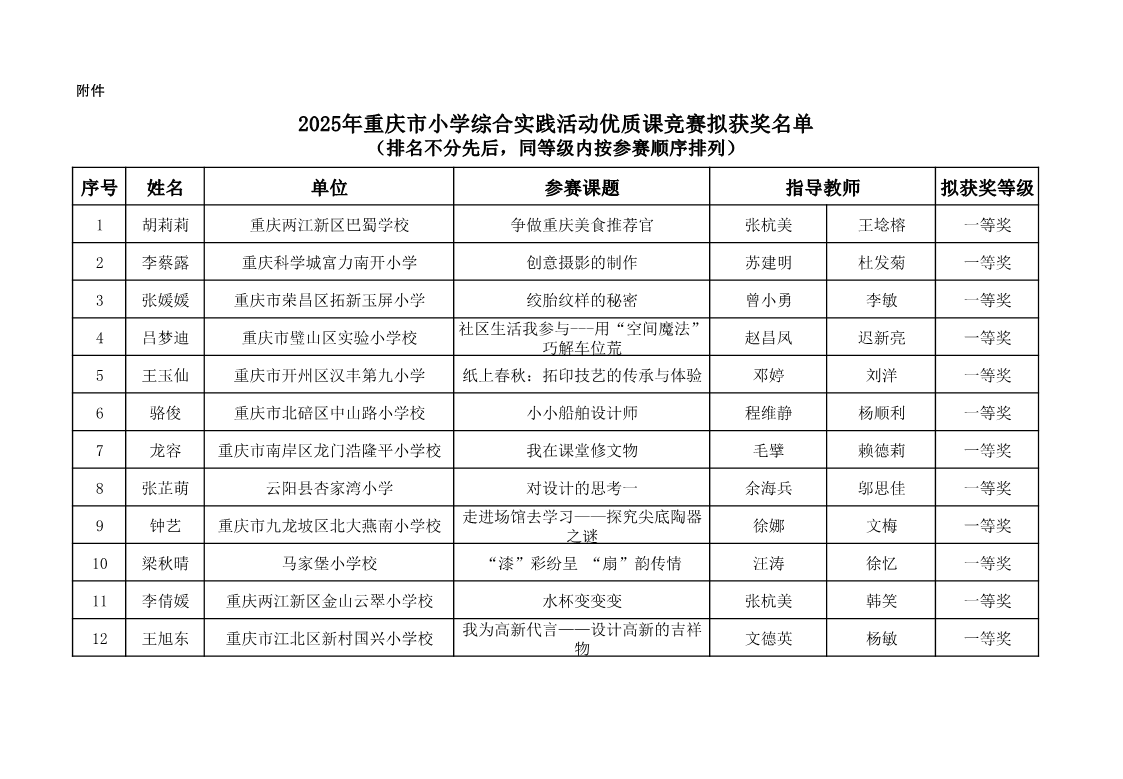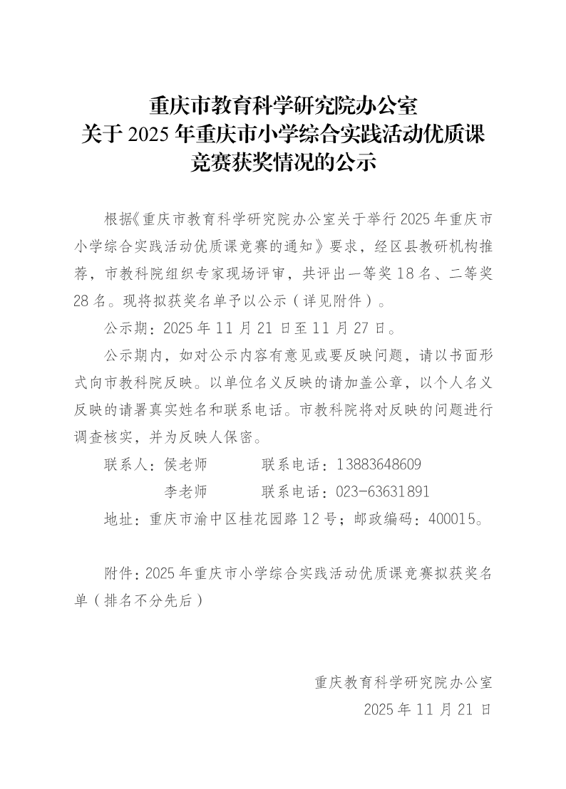 重庆市教育科学研究院办公室关于2025年重庆市小学综合实践活动优质课竞赛获奖情况的公示