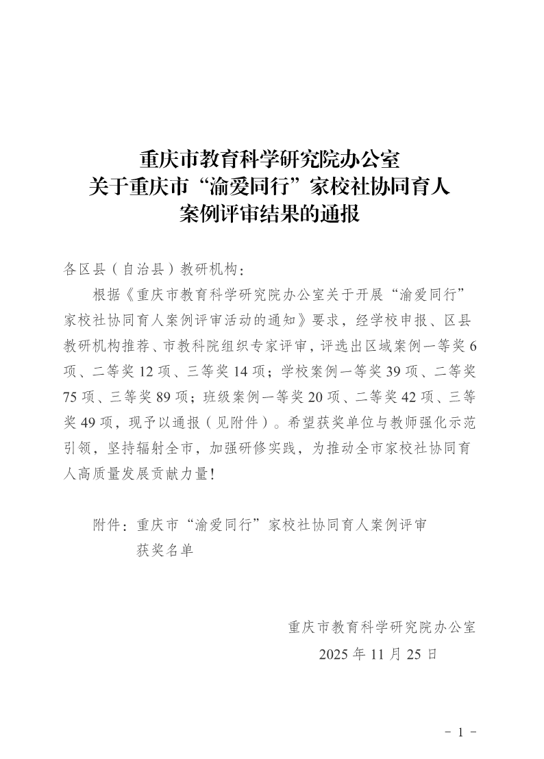 重庆市教育科学研究院办公室关于重庆市“渝爱同行”家校社协同育人案例评审结果的通报