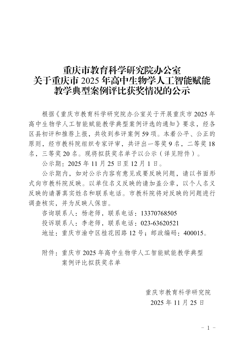 重庆市教育科学研究院办公室关于重庆市 2025年高中生物学人工智能赋能教学典型案例评比获奖情况的公示