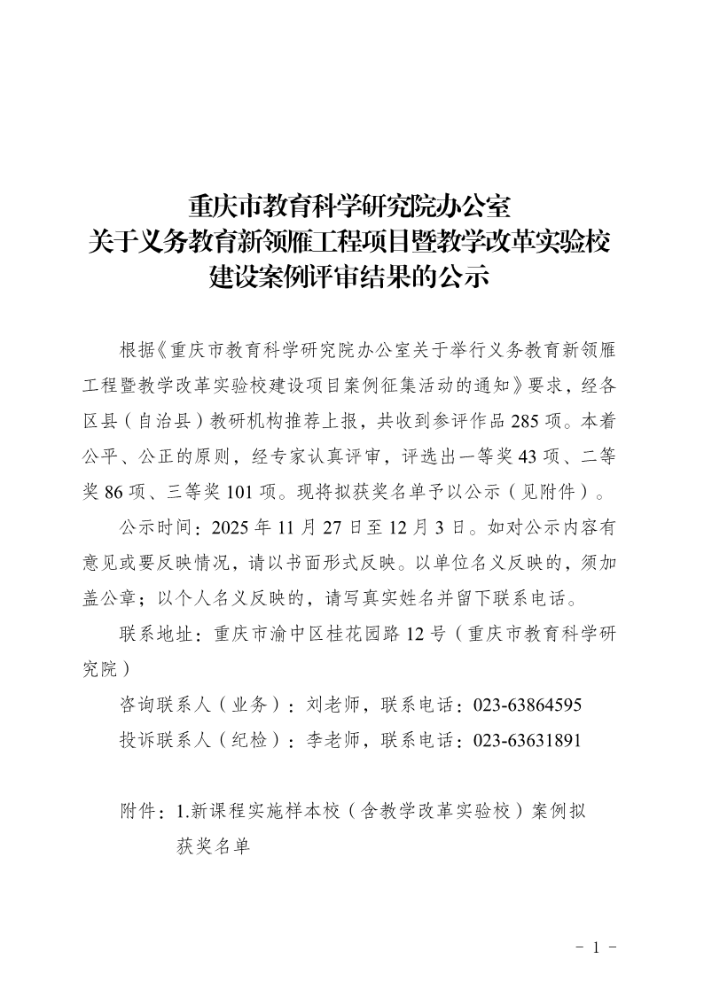 重庆市教育科学研究院办公室关于义务教育新领雁工程项目暨教学改革实验校建设案例评审结果的公示