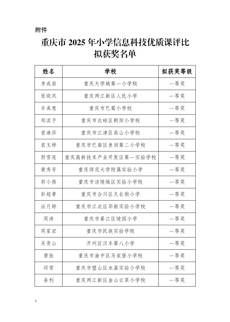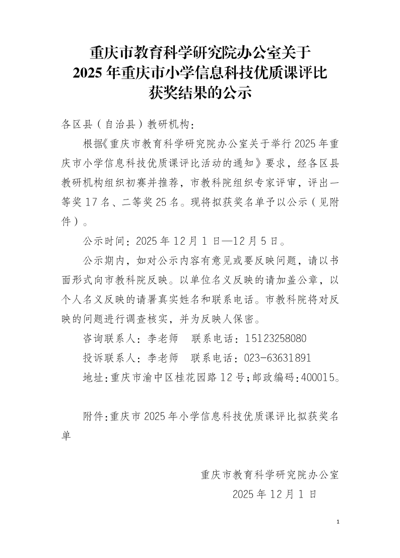 重庆市教育科学研究院办公室关于2025年重庆市小学信息科技优质课评比获奖结果的公示