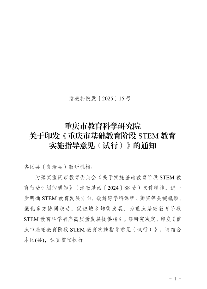 重庆市教育科学研究院关于印发《重庆市基础教育阶段 stem 教育实施指导意见(试行)》的通知
