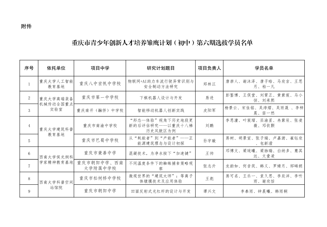 重庆市教育科学研究院办公室关于重庆市青少年创新人才培养雏鹰计划 (初中)第六期选拔学员名单公示