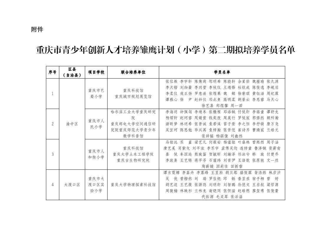 重庆市教育科学研究院办公室关于重庆市青少年创新人才培养雏鹰计划 (小学)第二期学员名单公示