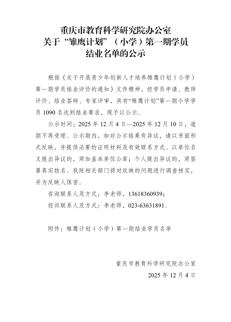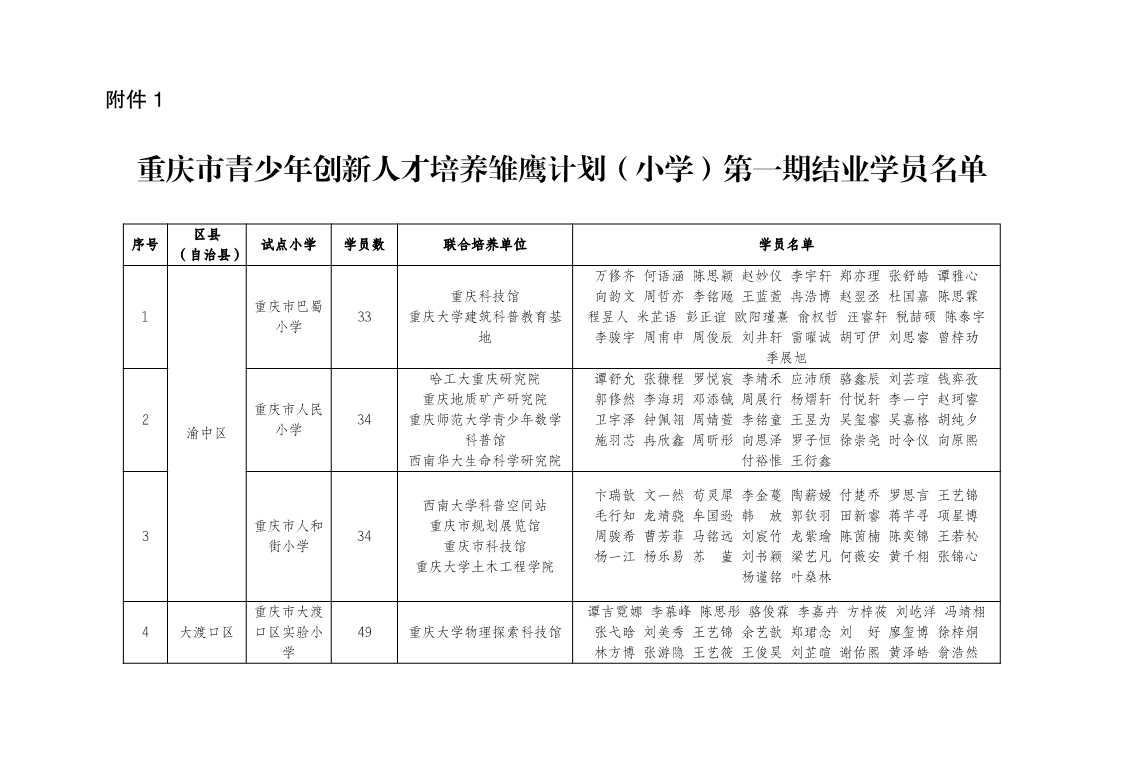 重庆市教育科学研究院办公室关于“雏鹰计划”(小学)第一期学员 结业名单的公示