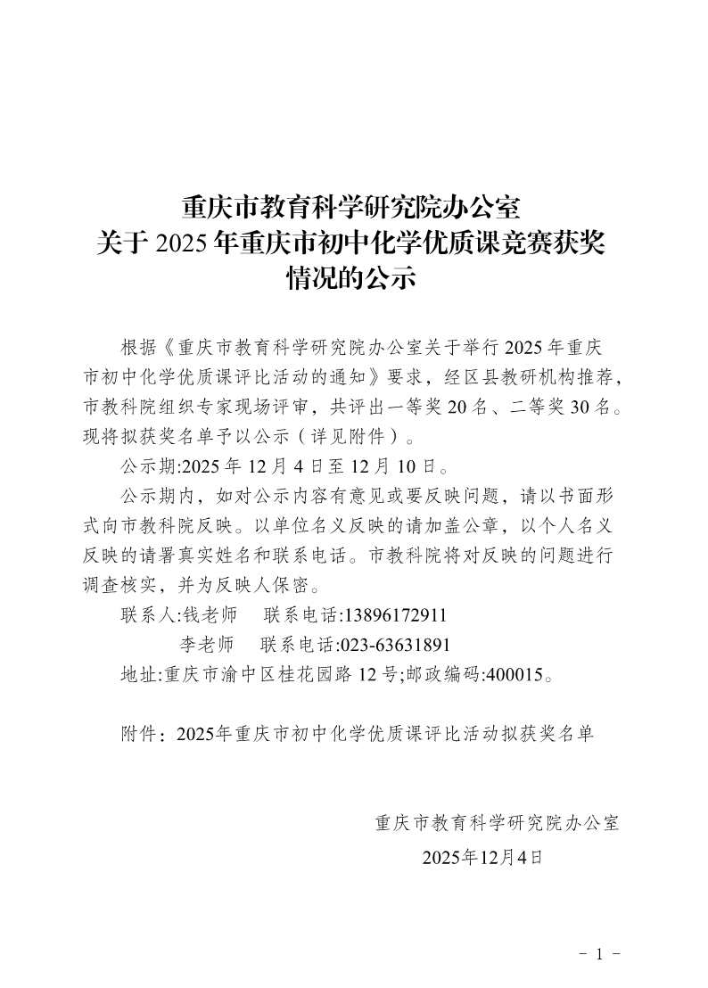重庆市教育科学研究院办公室关于2025年重庆市初中化学优质课竞赛获奖情况的公示