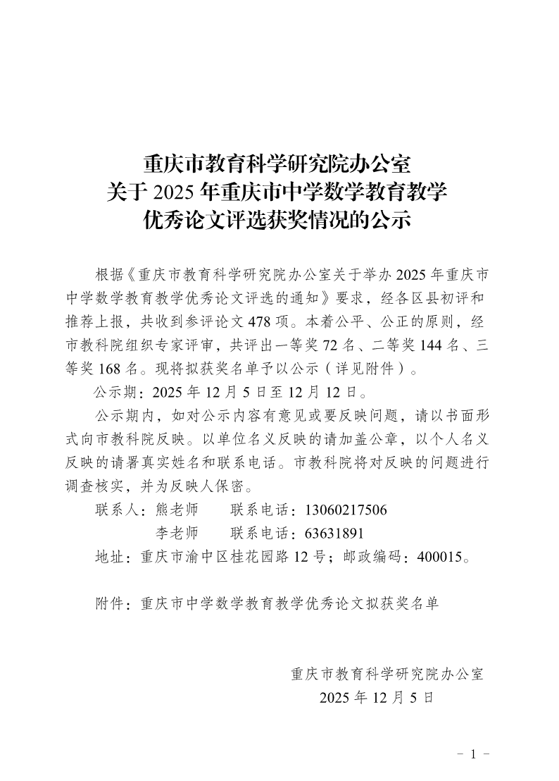 重庆市教育科学研究院办公室关于2025年重庆市中学数学教育教学优秀论文评选获奖情况的公示