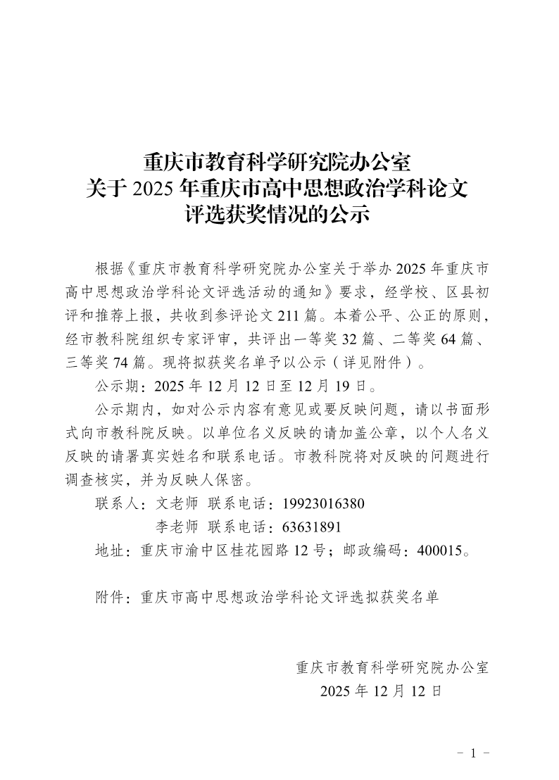 重庆市教育科学研究院办公室关于2025年重庆市高中思想政治学科论文评选获奖情况的公示
