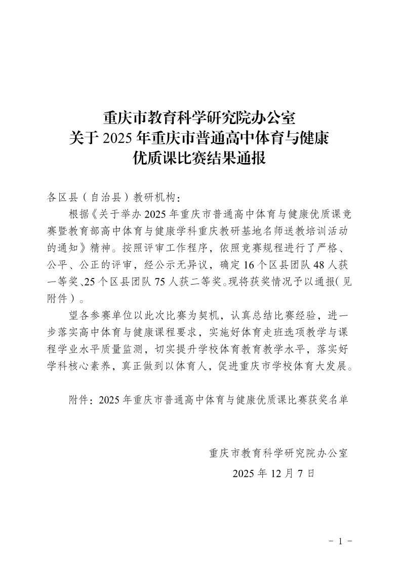 重庆市教育科学研究院办公室关于2025年重庆市普通高中体育与健康优质课比赛结果通报