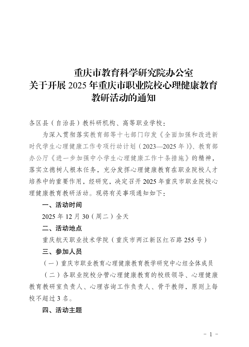 重庆市教育科学研究院办公室关于开展2025年重庆市职业院校心理健康教育教研活动的通知