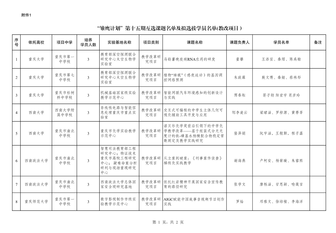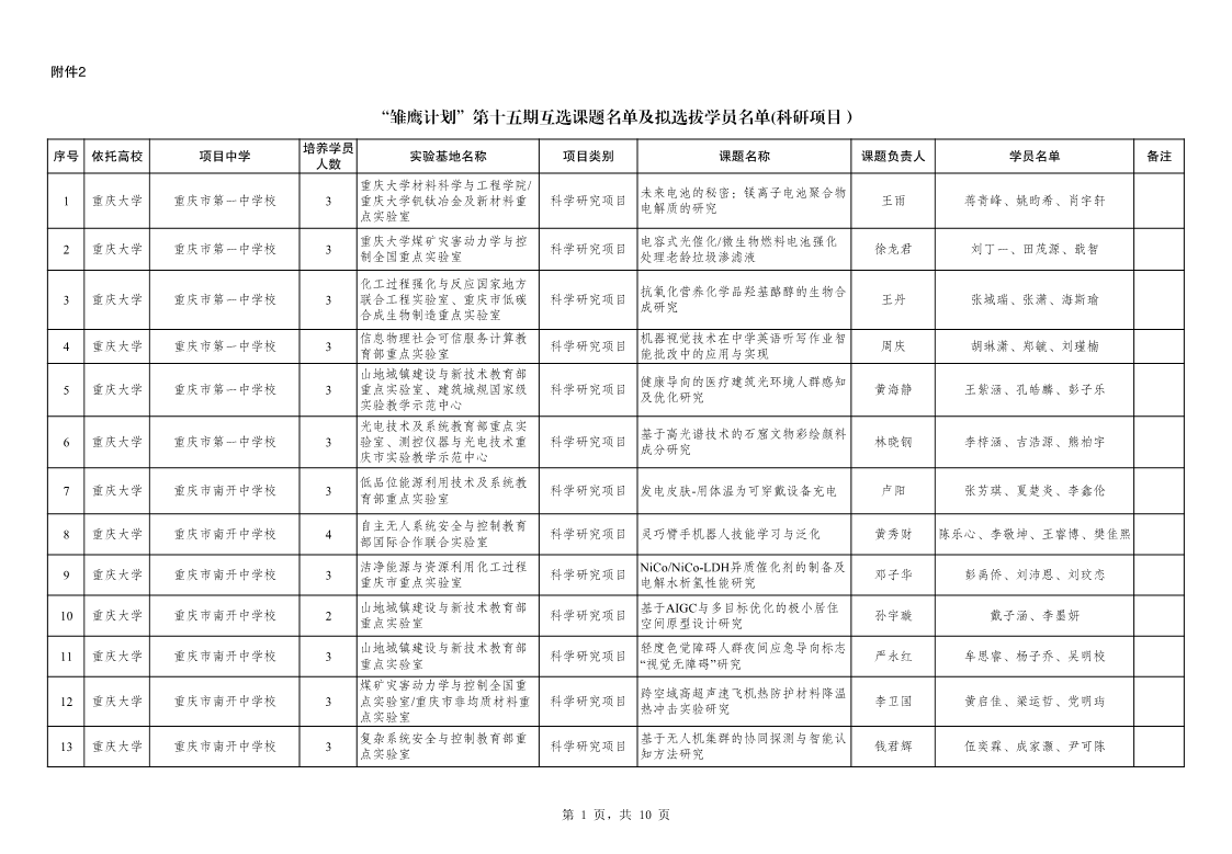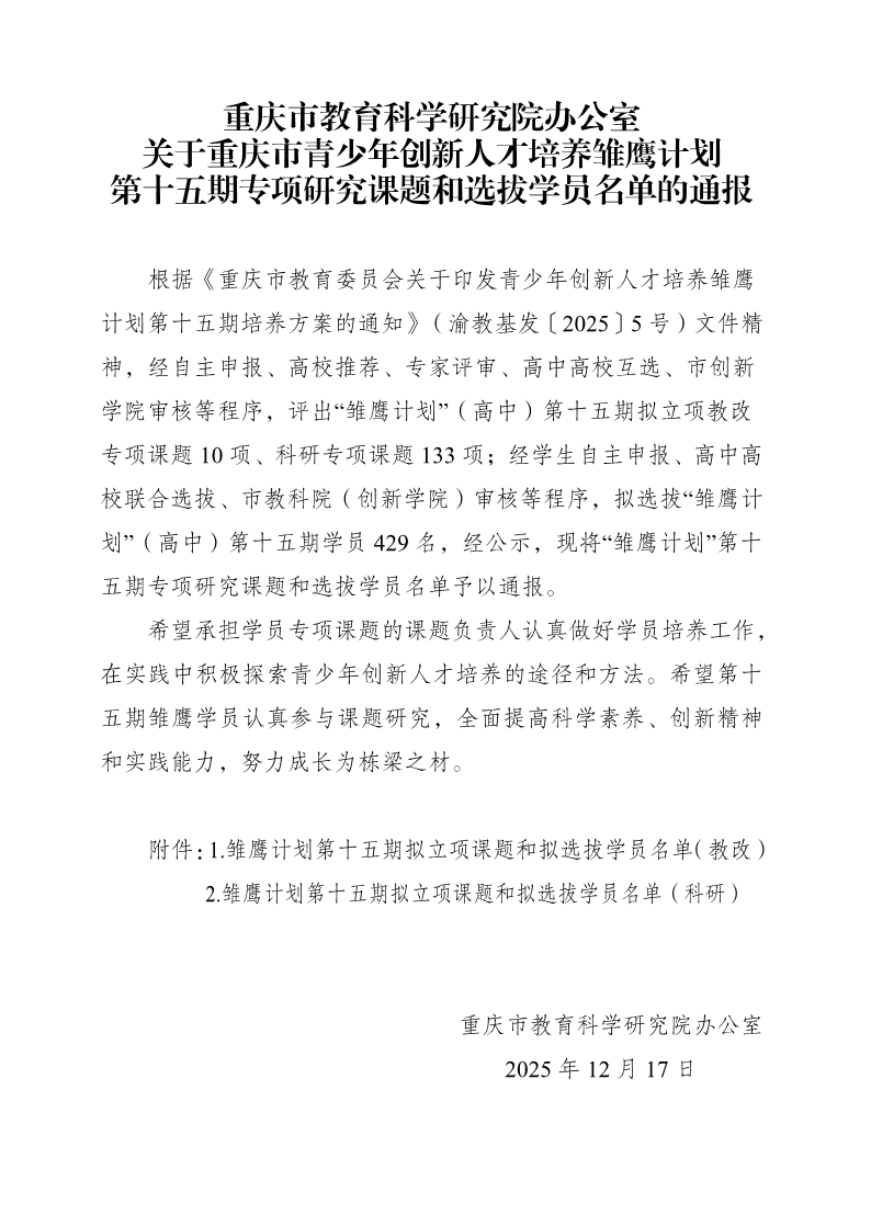 重庆市教育科学研究院办公室关于重庆市青少年创新人才培养雏鹰计划第十五期专项研究课题和选拔学员名单的通报
