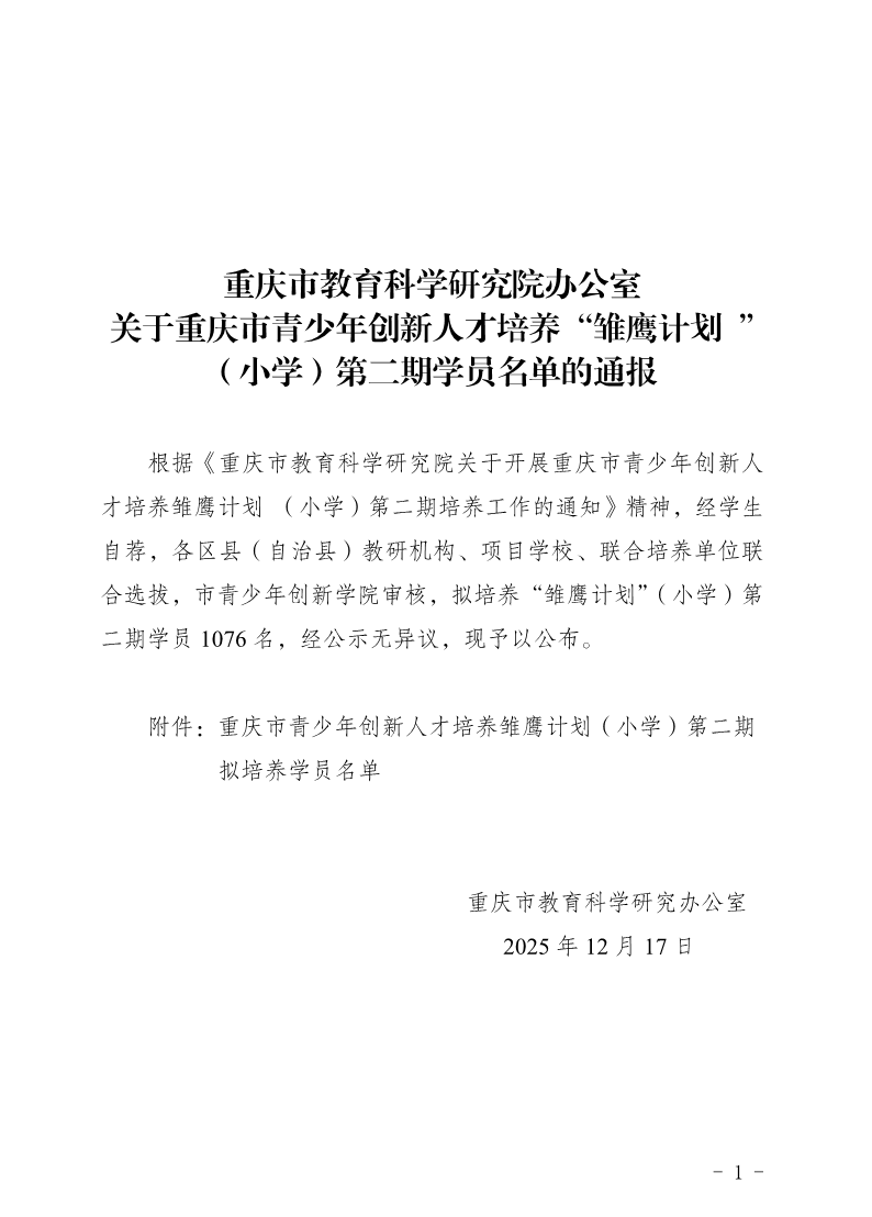 重庆市教育科学研究院办公室关于重庆市青少年创新人才培养“雏鹰计划 ”(小学)第二期学员名单的通报