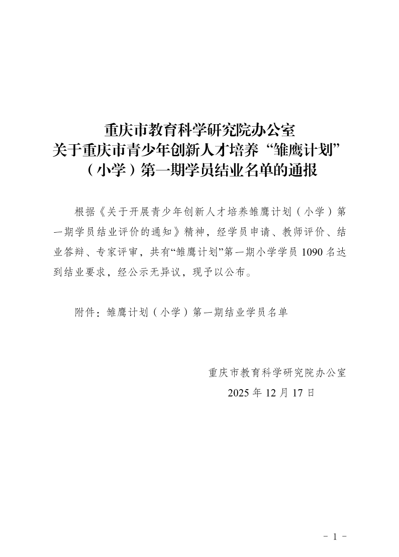重庆市教育科学研究院办公室关于重庆市青少年创新人才培养“雏鹰计划”(小学)第一期学员结业名单的通报