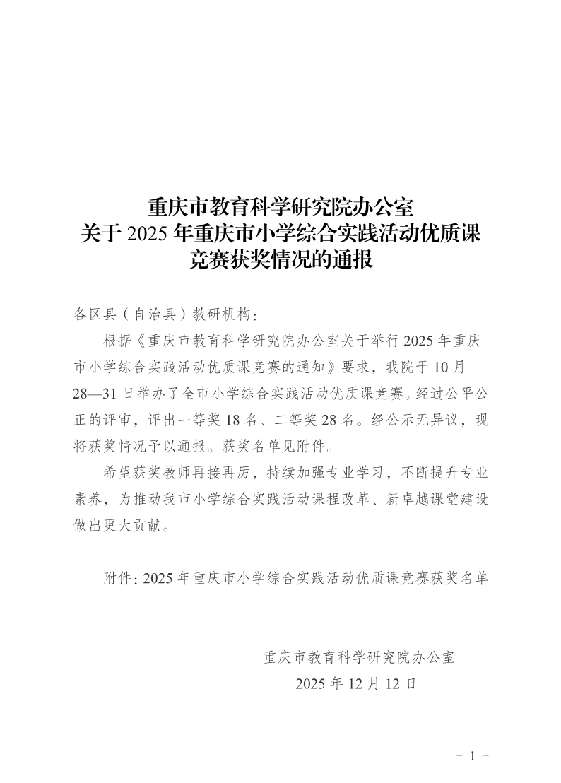 重庆市教育科学研究院办公室关于2025年重庆市小学综合实践活动优质课竞赛获奖情况的通报