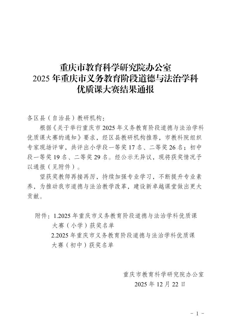 重庆市教育科学研究院办公室2025年重庆市义务教育阶段道德与法治学科优质课大赛结果通报