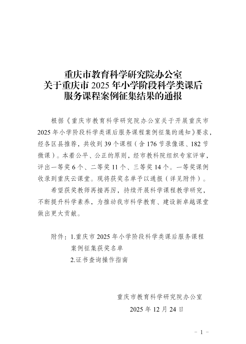 重庆市教育科学研究院办公室关于重庆市2025年小学阶段科学类课后服务课程案例征集结果的通报