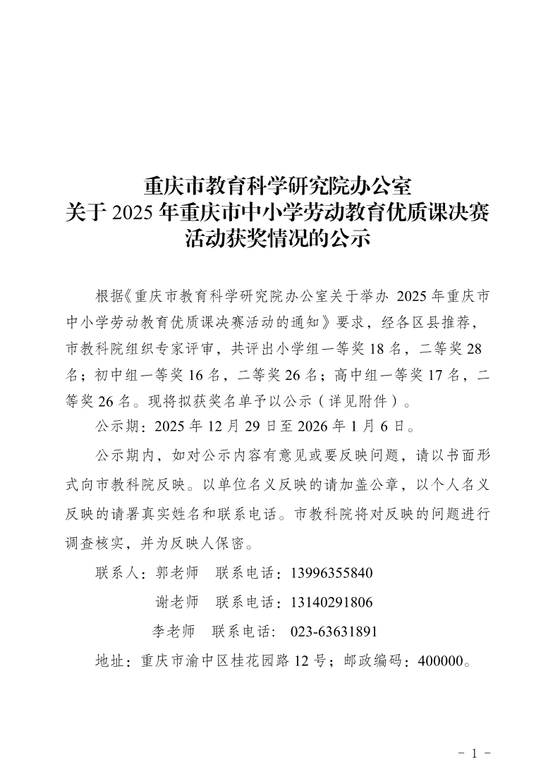 重庆市教育科学研究院办公室关于2025年重庆市中小学劳动教育优质课决赛活动获奖情况的公示