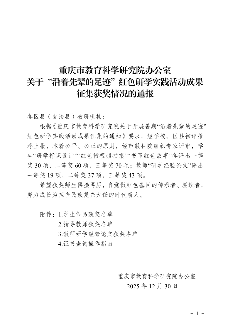 重庆市教育科学研究院办公室关于“沿着先辈的足迹”红色研学实践活动成果征集获奖情况的通报