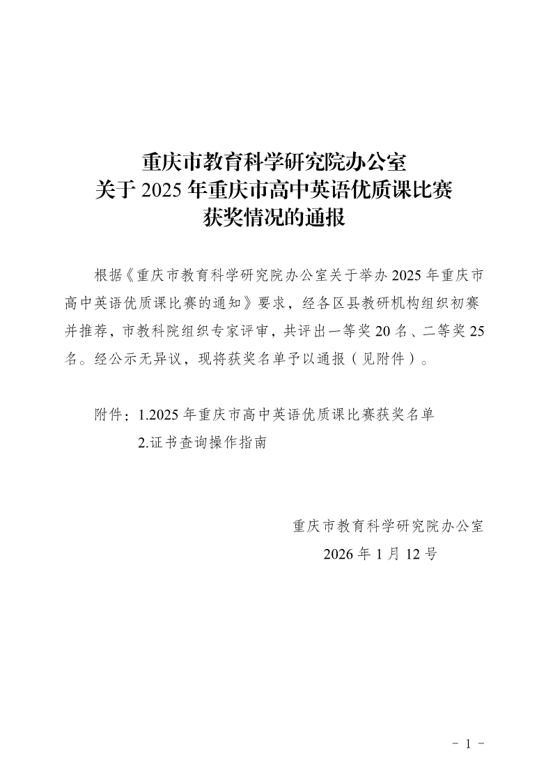 重庆市教育科学研究院办公室关于2025年重庆市高中英语优质课比赛获奖情况的通报