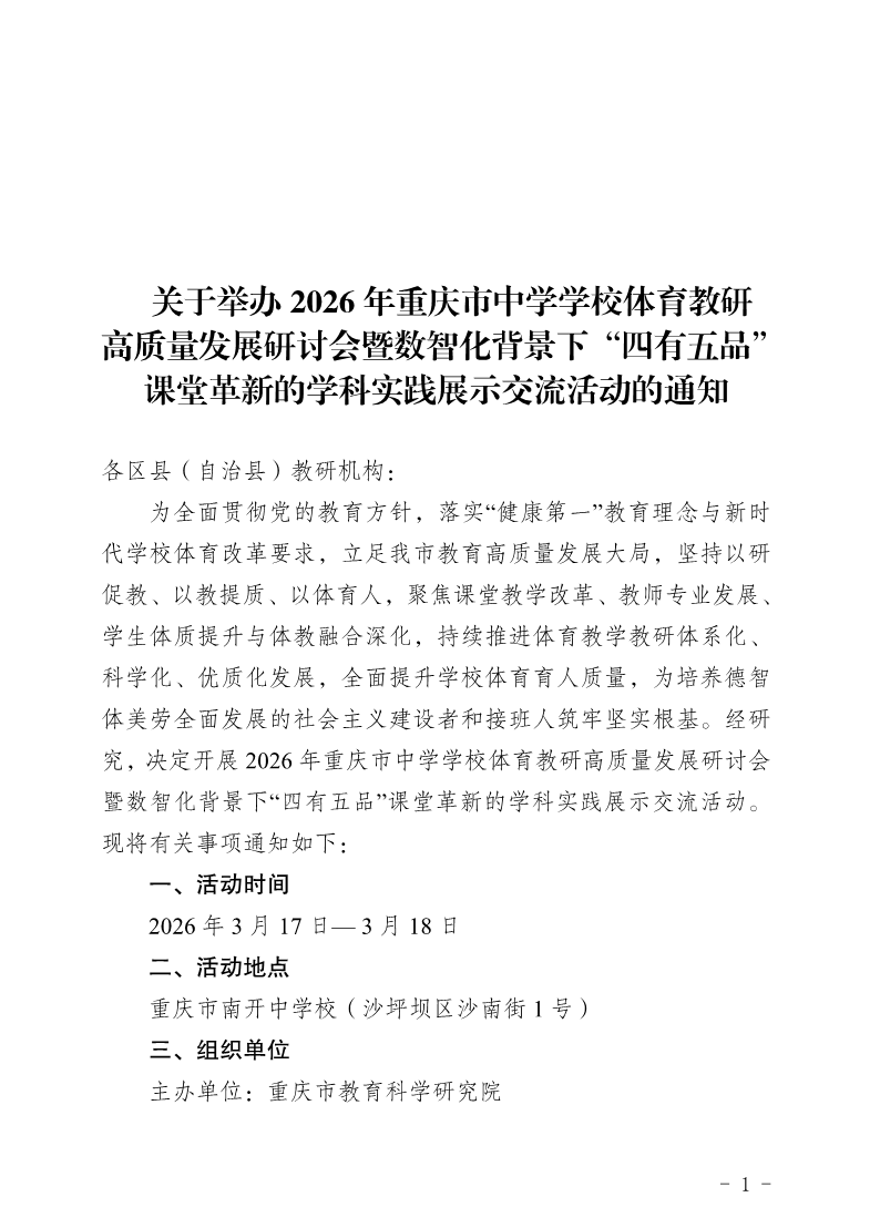 关于举办2026年重庆市中学学校体育教研高质量发展研讨会暨数智化背景下“四有五品” 课堂革新的学科实践展示交流活动的通知 作者: 来源: 发布时间:2026年03月06日 点击数: 次 【字体: 】 分享到: